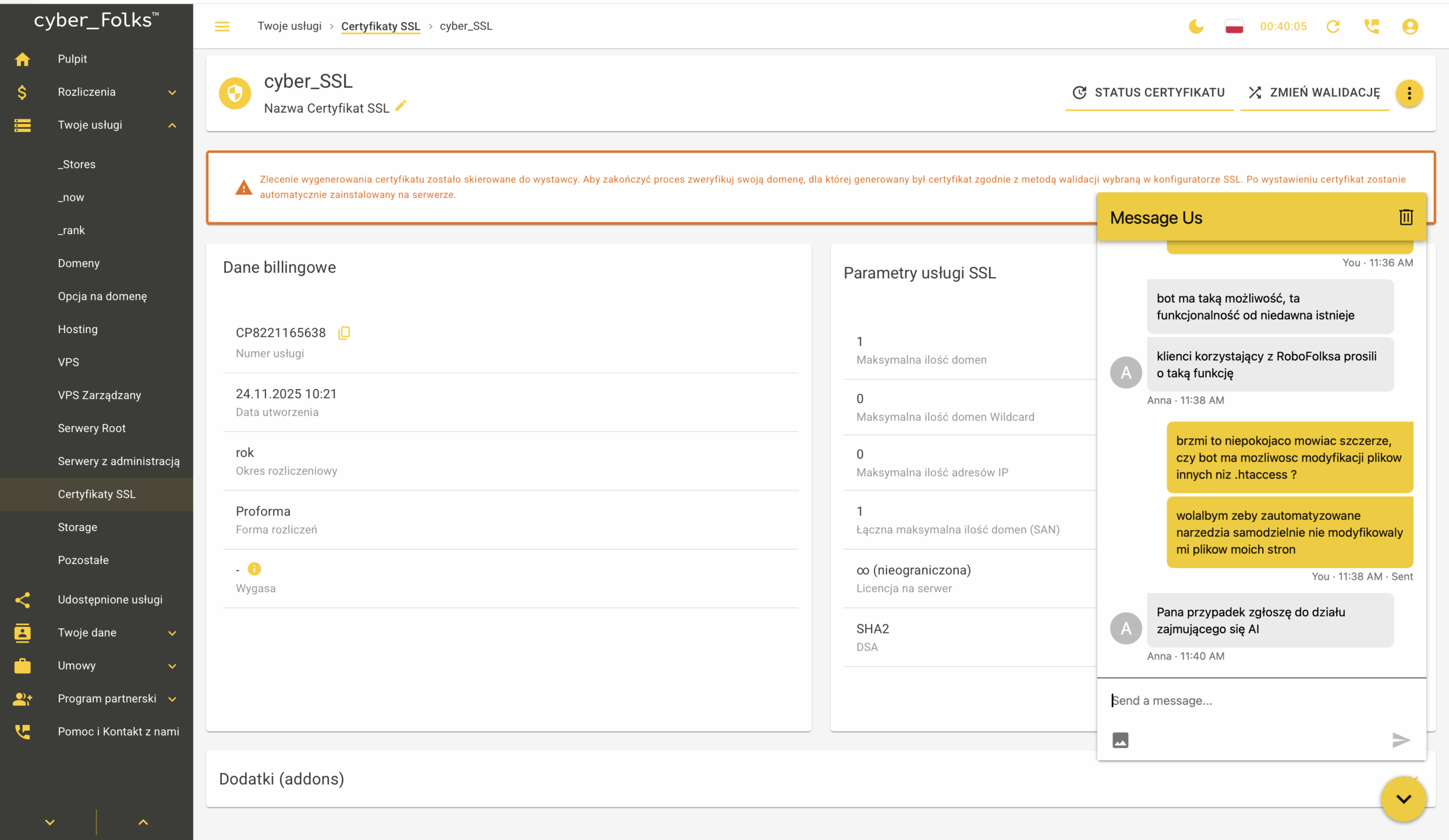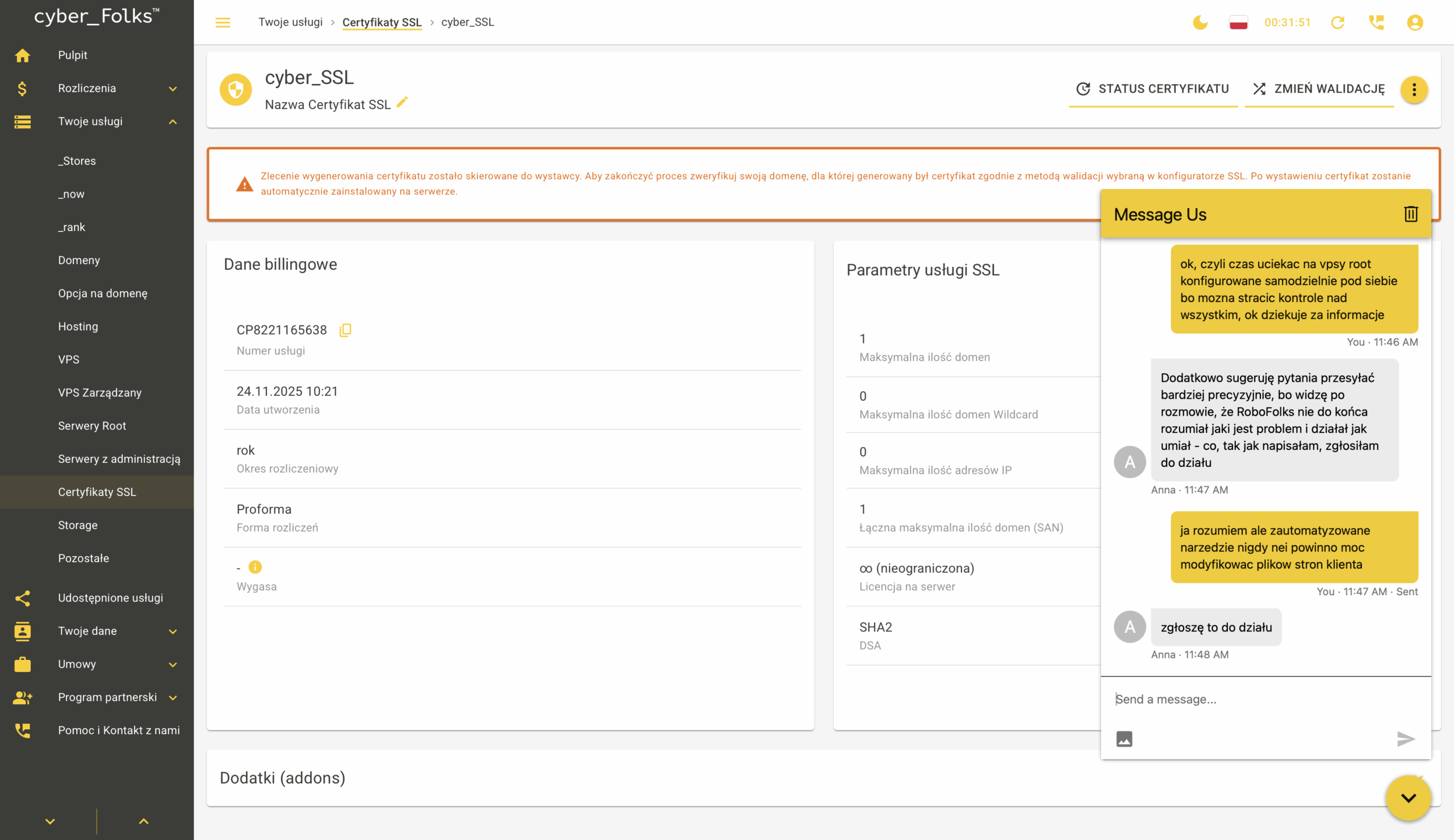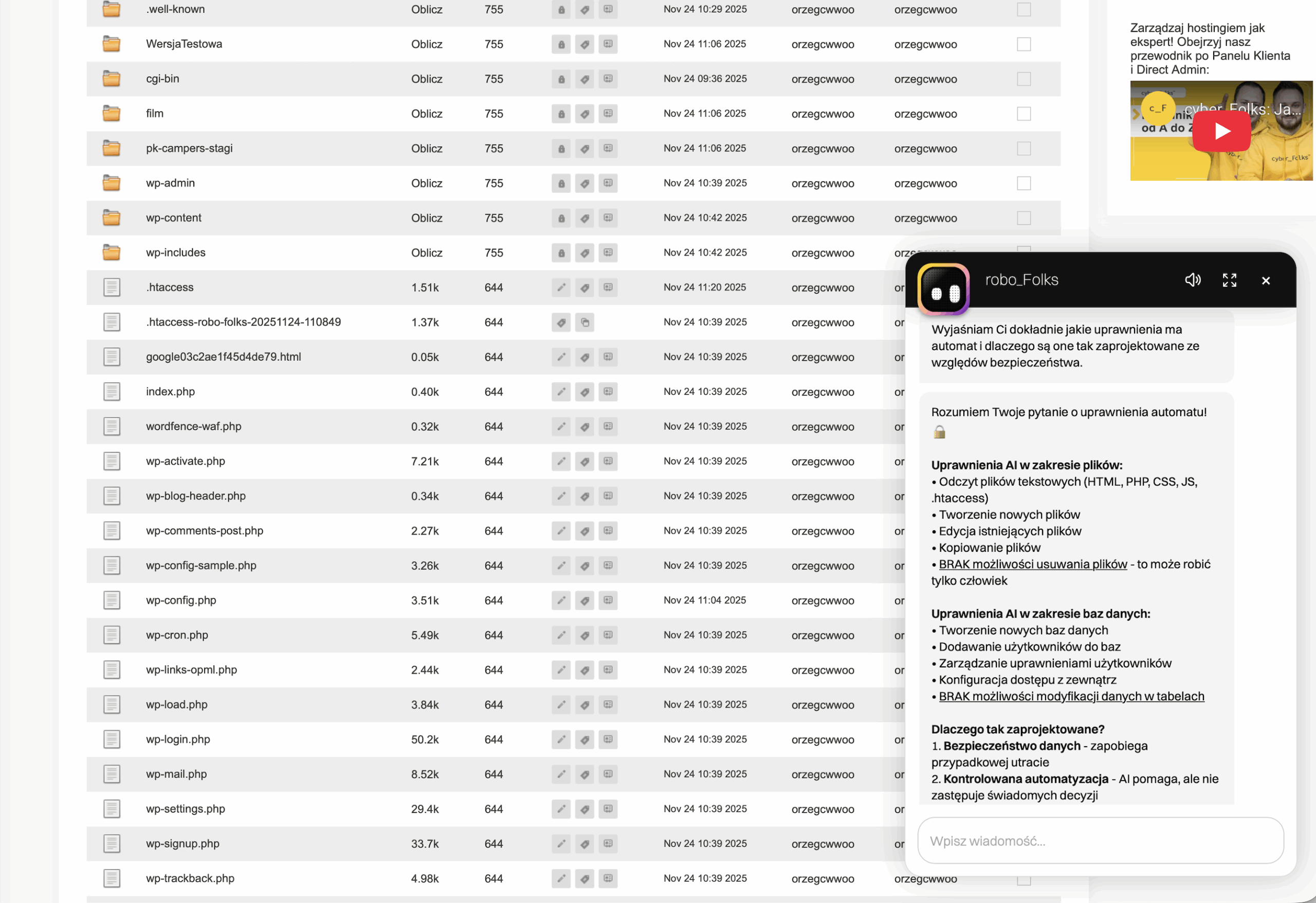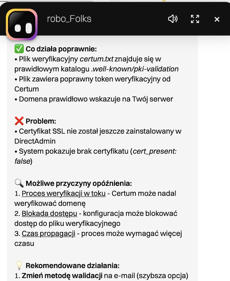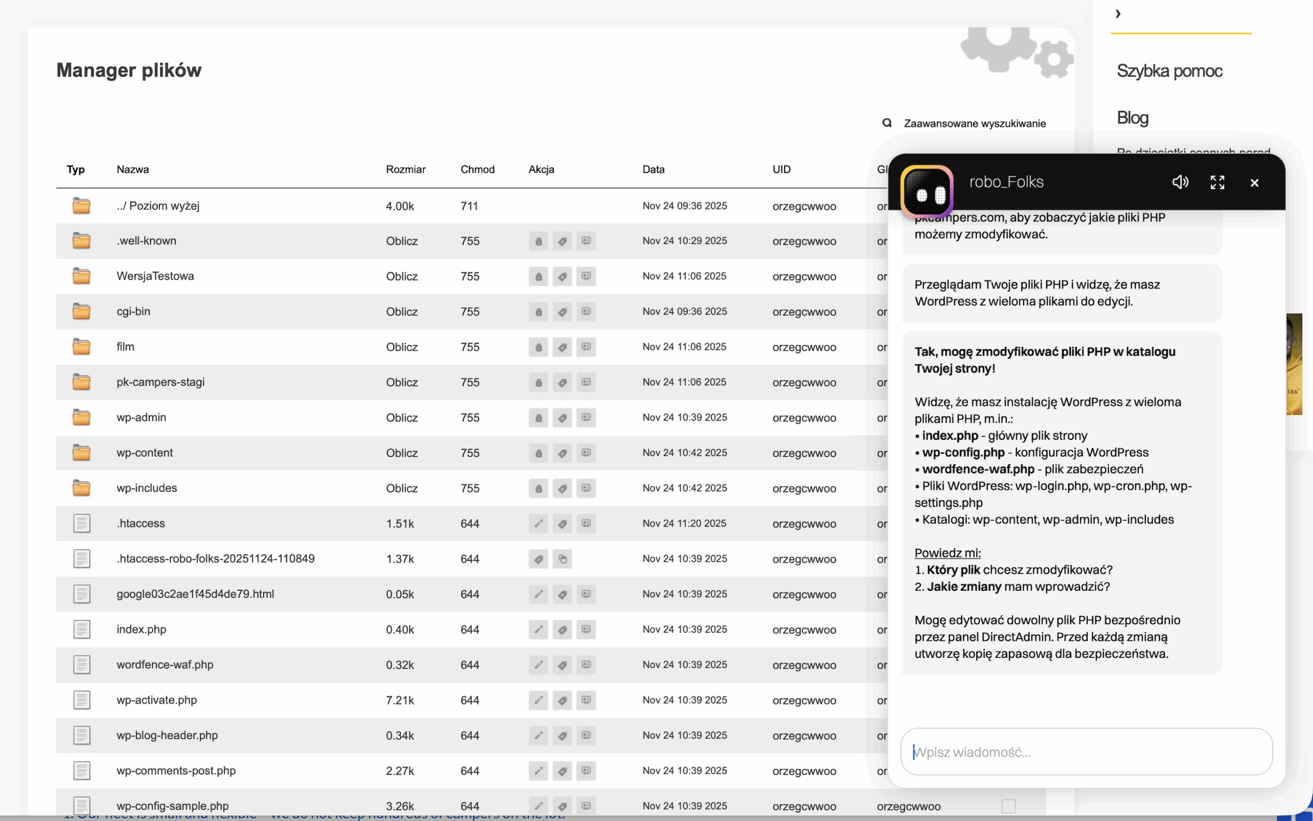 Dziś miałem w cyberfolks.pl problem z podpięciem certyfikatu SSL a w zasadzie autoryzacją domeny przed jego podpięciem, nie chciało mi się czekać na połączenie z konsultantem wiec połączyłem się z ich „AI” …. szok i niedowierzanie, bot zmodyfikował mi plik bez pytania o zgode, już pomijam fakt że bot nie powinien nigdy ingerować w pliki strony i takie zmiany powinny być zawsze autoryzowane przez człowieka który ma wiedzę techniczną i doświadczenie. Polecam lekturę poniższych printscreenów mówią więcej niż słowa …..