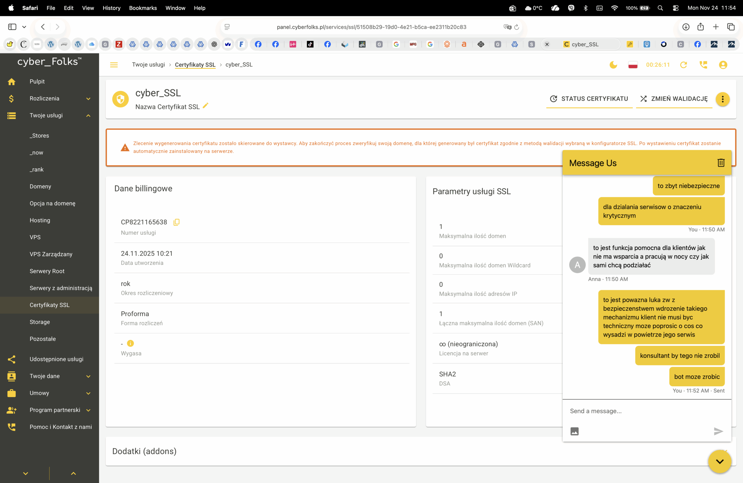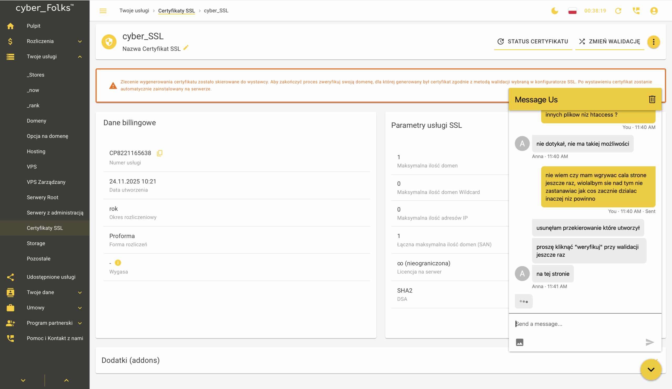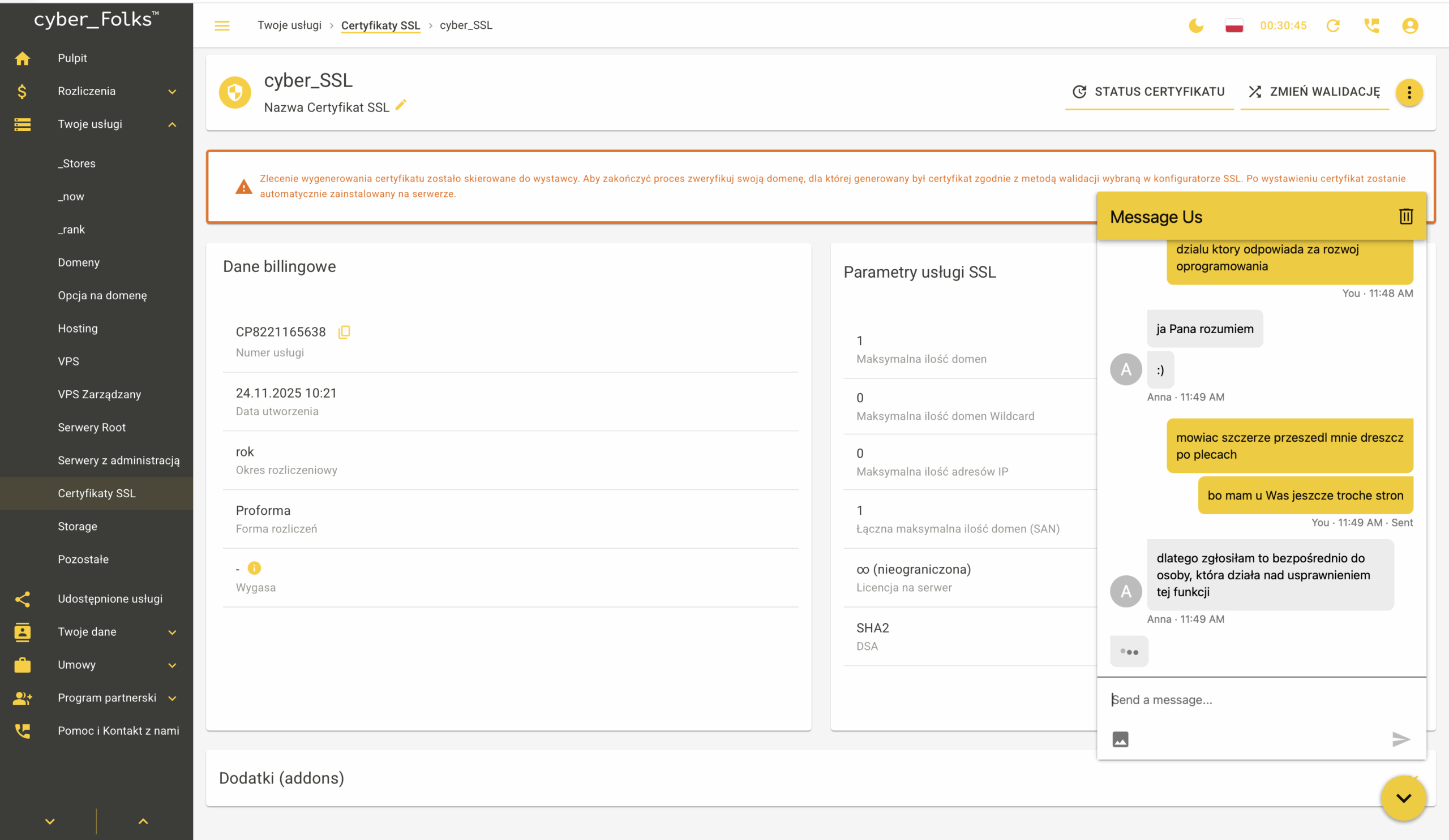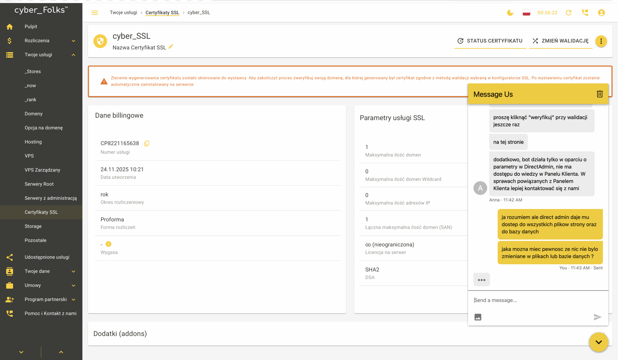 Dziś miałem w cyberfolks.pl problem z podpięciem certyfikatu SSL a w zasadzie autoryzacją domeny przed jego podpięciem, nie chciało mi się czekać na połączenie z konsultantem wiec połączyłem się z ich „AI” …. szok i niedowierzanie, bot zmodyfikował mi plik bez pytania o zgode, już pomijam fakt że bot nie powinien nigdy ingerować w pliki strony i takie zmiany powinny być zawsze autoryzowane przez człowieka który ma wiedzę techniczną i doświadczenie. Polecam lekturę poniższych printscreenów mówią więcej niż słowa …..
