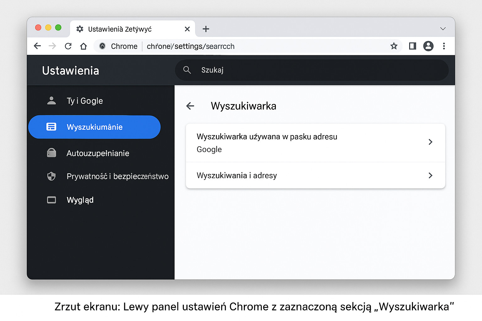 [Zrzut ekranu: Lewy panel ustawień Chrome z zaznaczoną sekcją „Wyszukiwarka”]