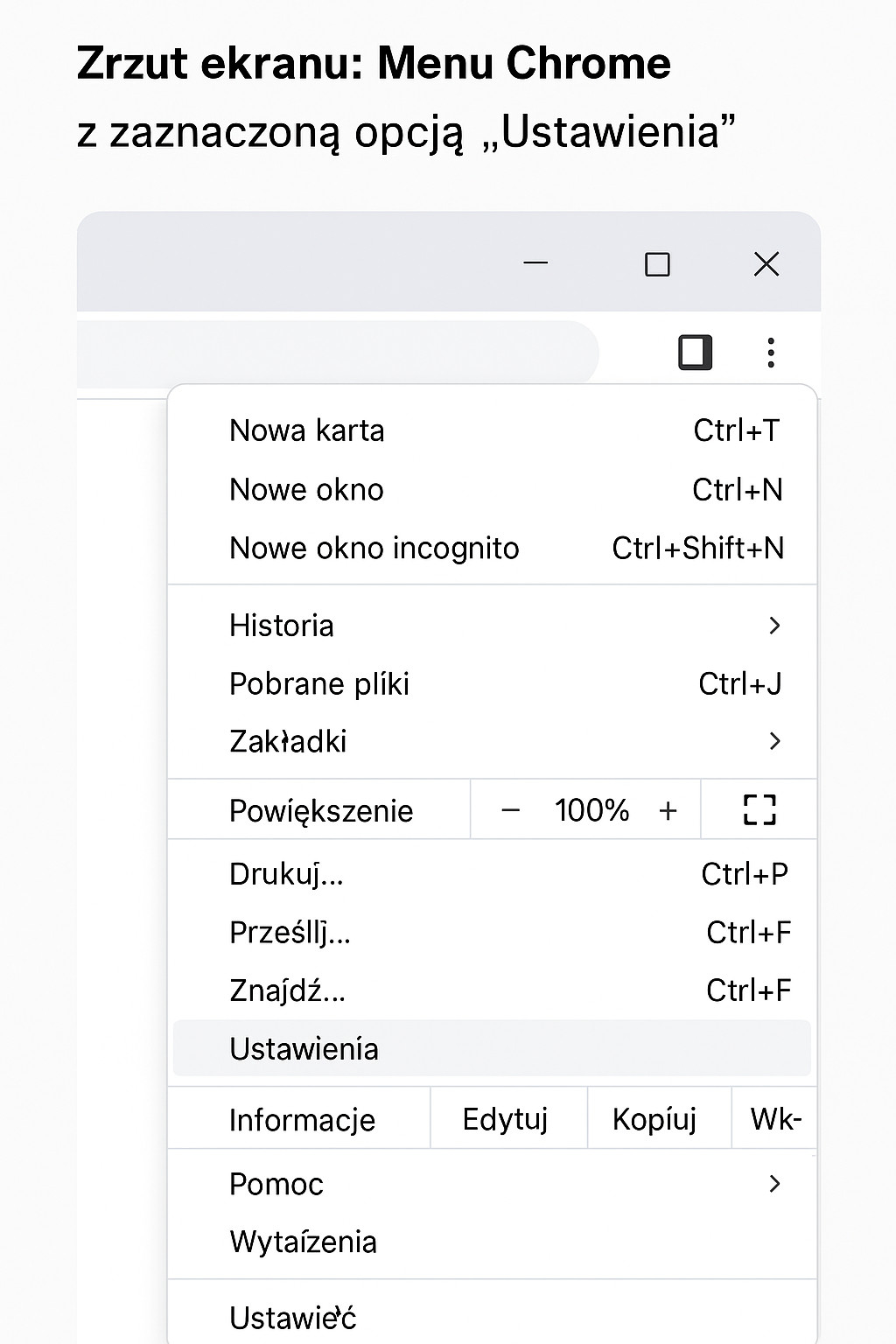 [Zrzut ekranu: Menu Chrome z zaznaczoną opcją „Ustawienia”]