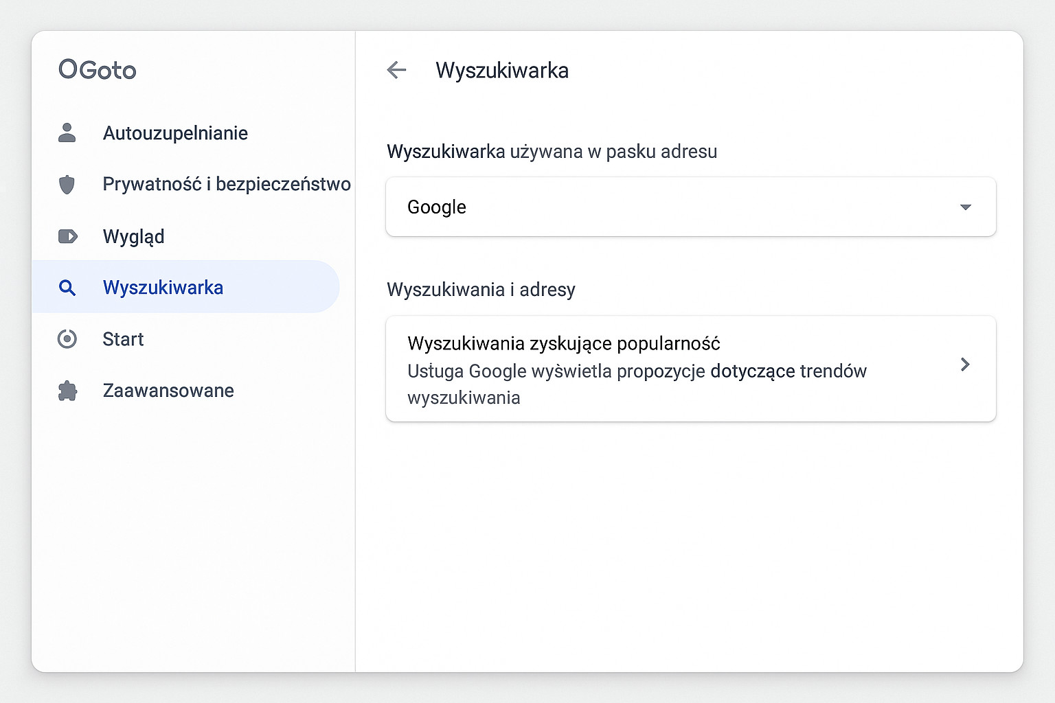 Znajdziesz tam ustawienia dotyczące domyślnej wyszukiwarki i sposobu wyświetlania sugestii.